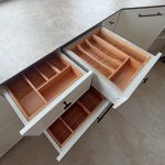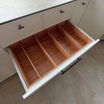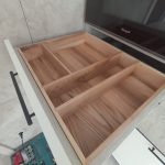 В рамках проекта изготовлены четыре лотка для столовых приборов из массива ясеня на заказ. Лотки выполнены по индивидуальным размерам под существующие ящики кухни, с учётом высоты фасадов и направляющих.